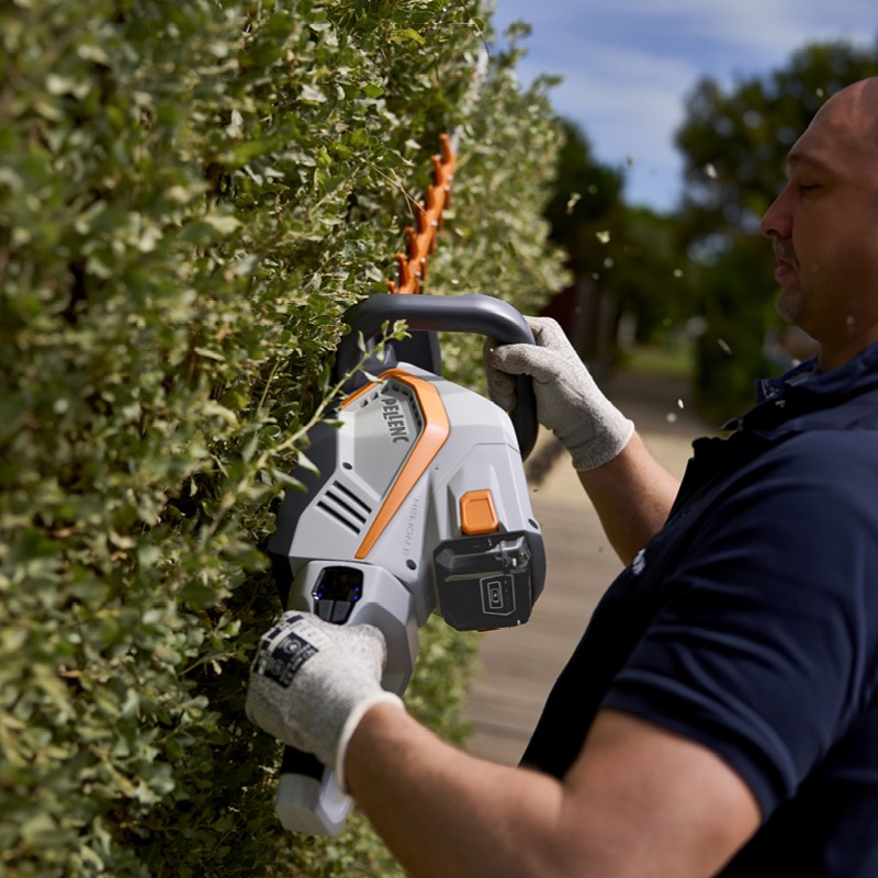 De HELION ESSENTIAL is uitgerust met een ingebouwde 200E-accu en een 64 cm dubbel snijdend mes (ref. 57339). Dit zorgt voor een zuivere, snelle en nauwkeurige snede, zelfs bij dikkere heggen. Dankzij de mogelijkheid om de machine aan te sluiten op ULiB- en ALPHA-rugaccu’s via een optionele connector (ref. 57355) verlengt u eenvoudig de werktijd voor intensieve klussen.